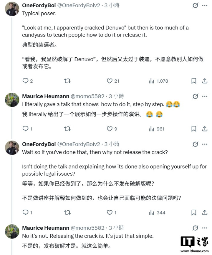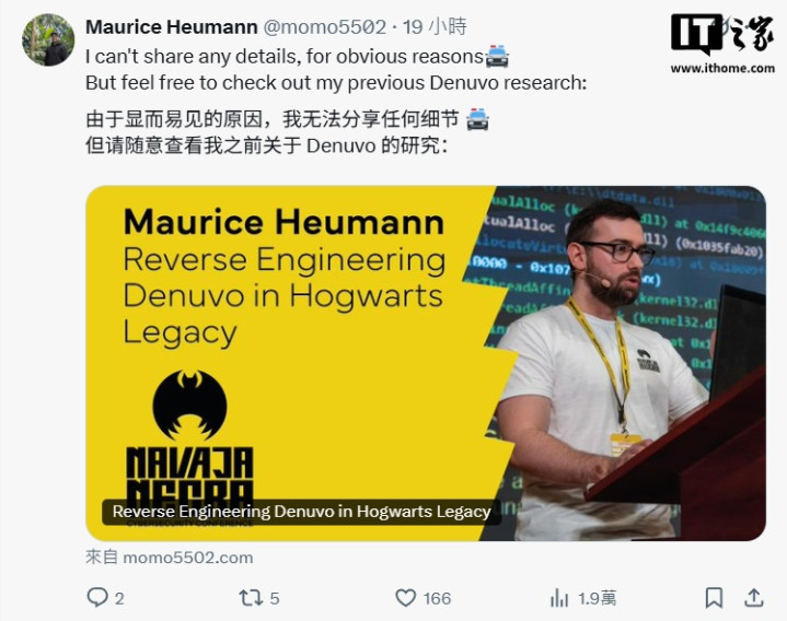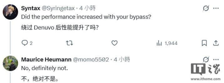 后续在评论区中Maurice表示,由于显而易见的原因,他无法分享任何相关细节或补丁,且绕过D加密后游戏性能没有提升;不过有玩家认为他不给具体细节是在“装X”,不过Maurice回复道,他此次绕过D加密仅用于NavajaNegra2025大赛的对比测试。